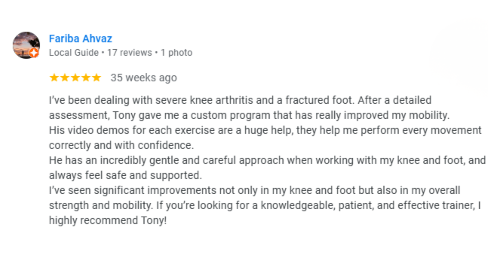 l had the best shape of my life when I trained with Tony. The martial arts training in his method is a game changer in exercising for me because it explores other skills that are different from what we find in regular gym training and helps me to relieve stress.